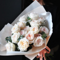 Букет из белых пионовидных роз и нежных кустовых роз в упаковке