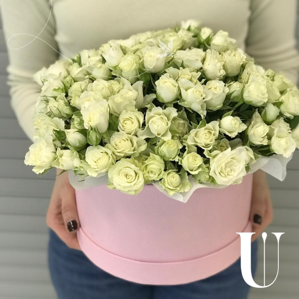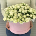 - Цветочная композиция в шляпной коробке. В составе 29 шт кустовых роз. Композиция собрана в специальной флористической губке