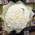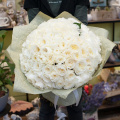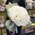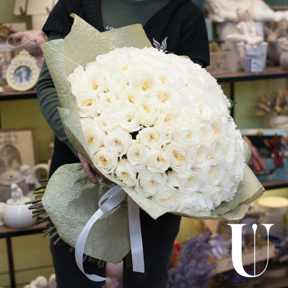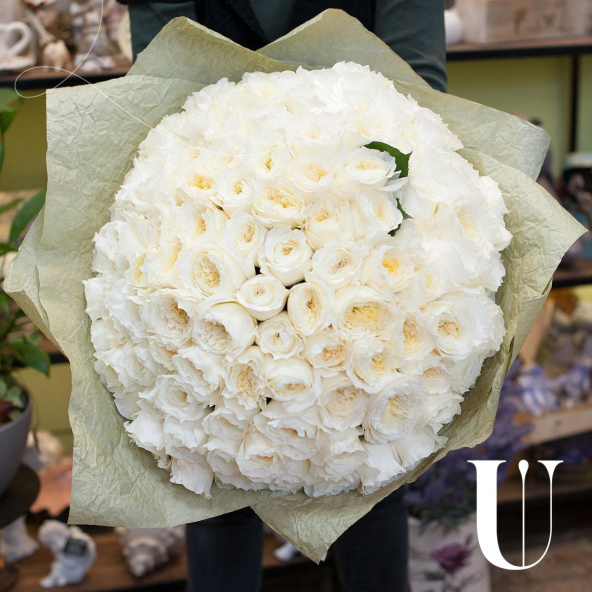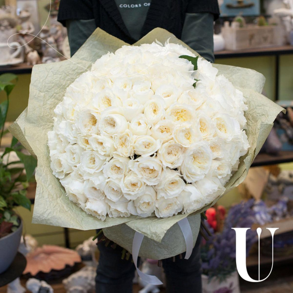 Букет состоит из 101 пионовидной розы белого цвета. Пионовидные розы отличаются от обычных своей формой и ароматом, который придает букету особую изысканность.