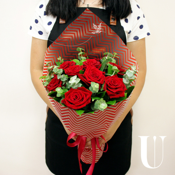 Монокомпозиция из кустовых роз в дизайнерской упаковке