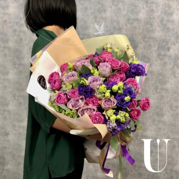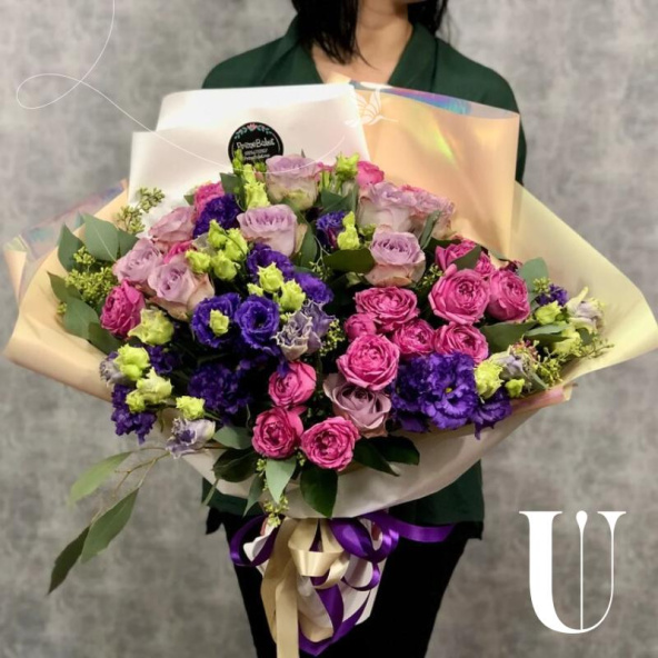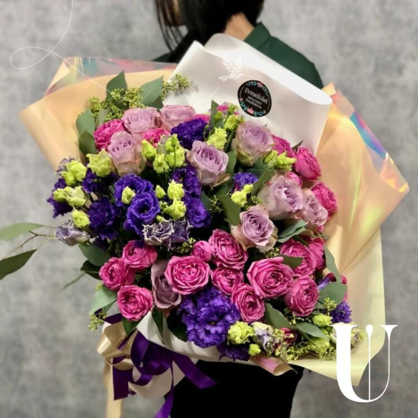 Эустома10шт Роза од. Морнинг Дью 10шт Мисти Баблс10шт Эвкалипт