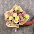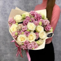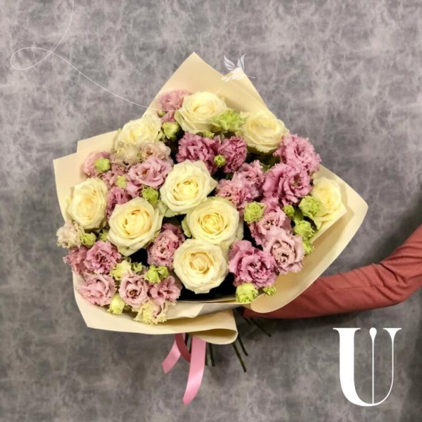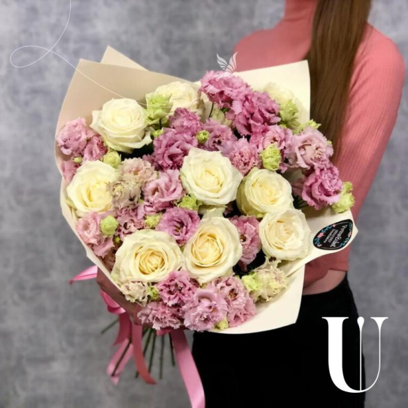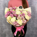 Монобукет из розовых роз и розового лагуруса в матовой пленке
