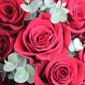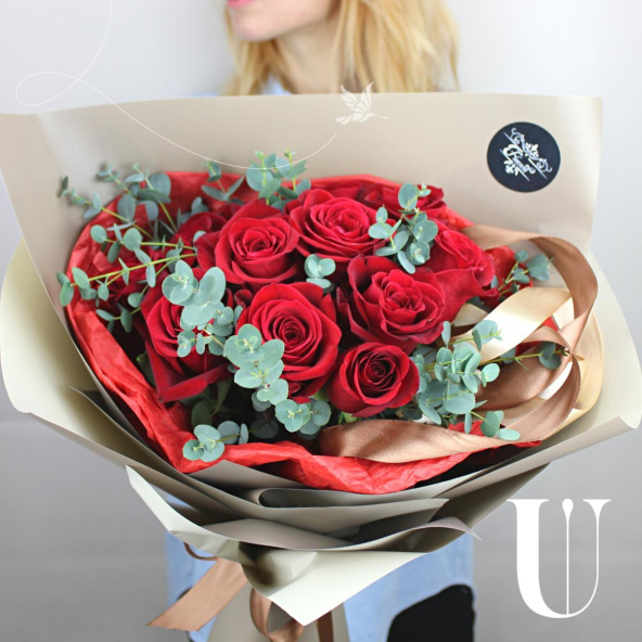 Романтическая композиция из красных роз и альстромерий в упаковке
