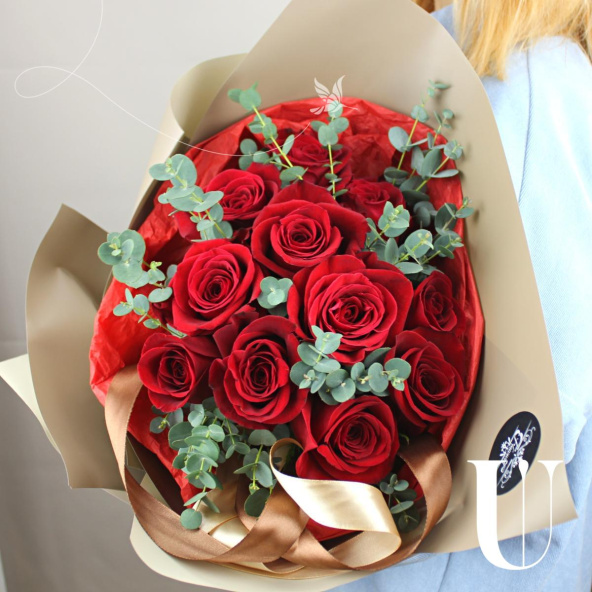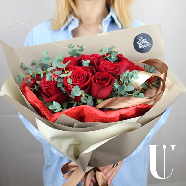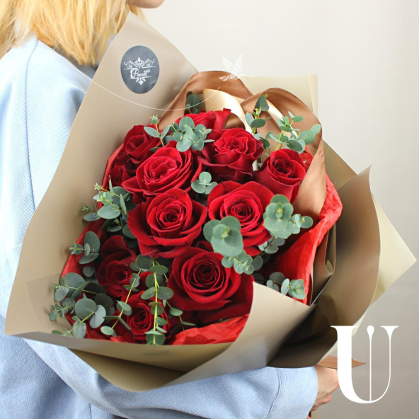 Монобукет из 19 роз сорта Гран При 70 см в крафтовой упаковке