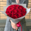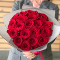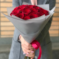 Мини-букет из 25 красных роз в упаковке с атласной лентой