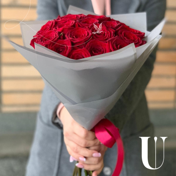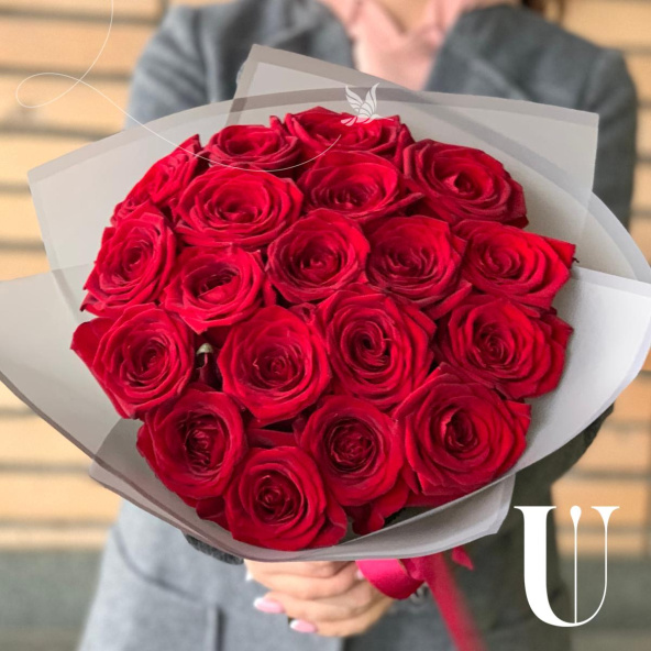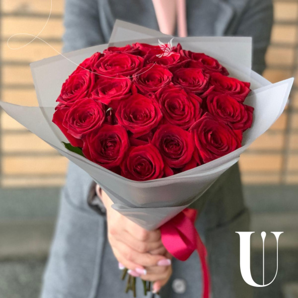 Романтичный букет из 19 красных роз в стильной упаковке