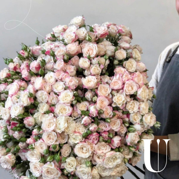 Большой букет из кремовых кустовых роз в голубой упаковке