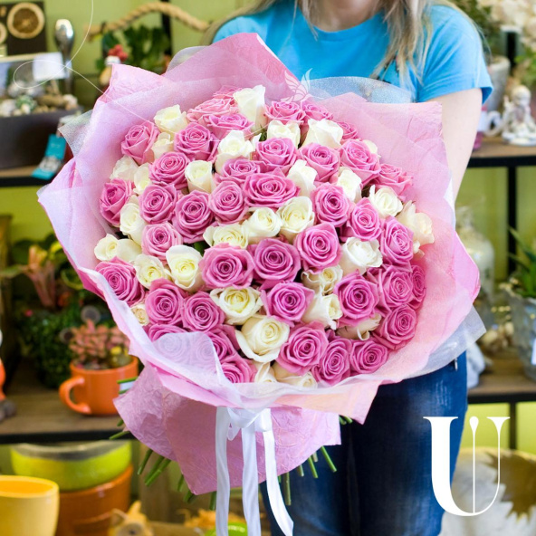 Монобукет из 75 розовых и белых роз в крафтовой упаковке