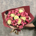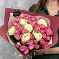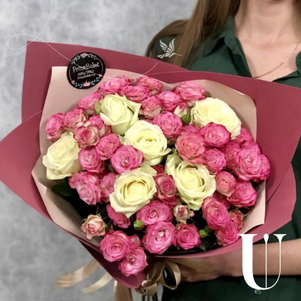 Монобукет из розовых роз и розового лагуруса в матовой пленке