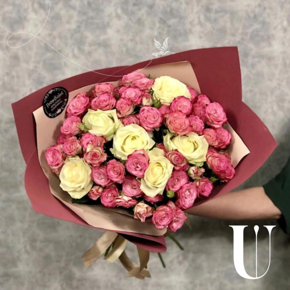 Монобукет из 7 роз Пинк Мондиаль в дизайнерской упаковке