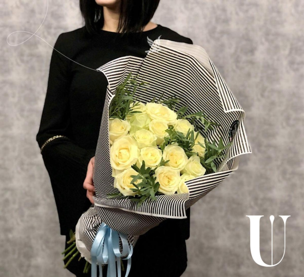 Монобукет из 15 роз сорта Аква 60 см в белой пленке