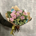 Монобукет из розовых роз и розового лагуруса в матовой пленке