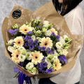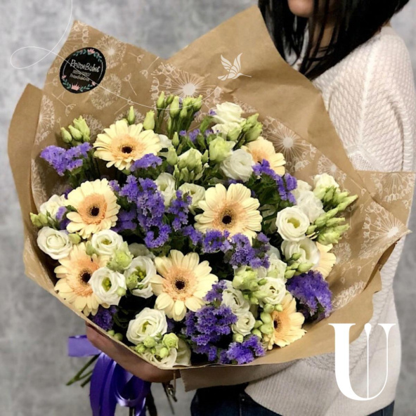 Нежные кустовые пионовидные розы в дизайнерской упаковке