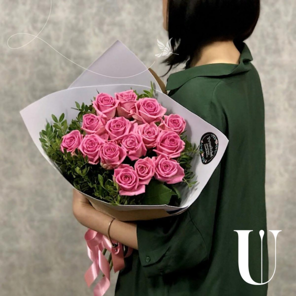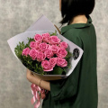 Монобукет из розовых роз и розового лагуруса в матовой пленке