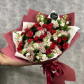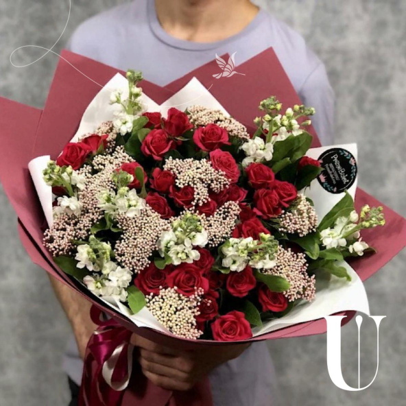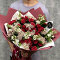 Романтическая композиция из красных роз и альстромерий в упаковке