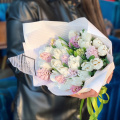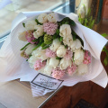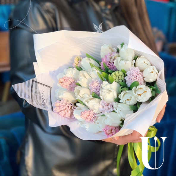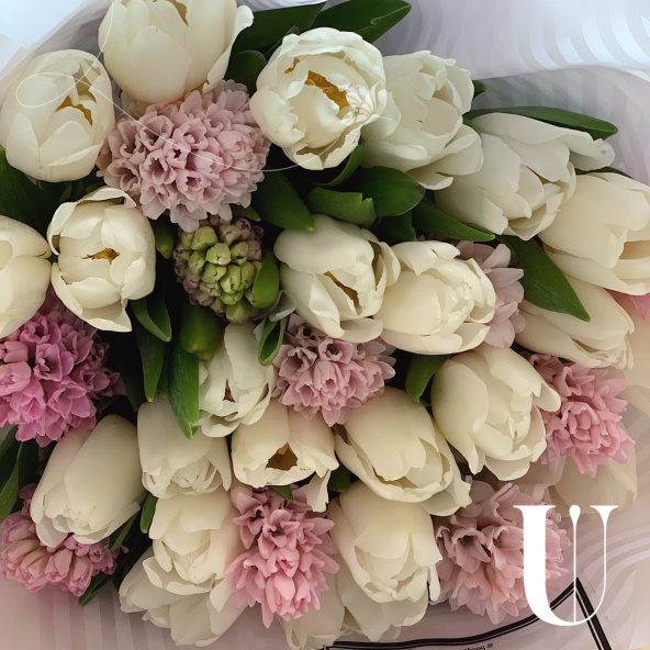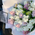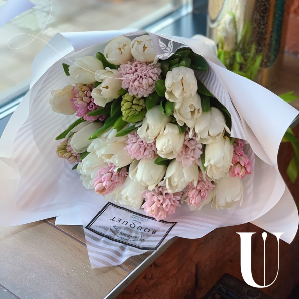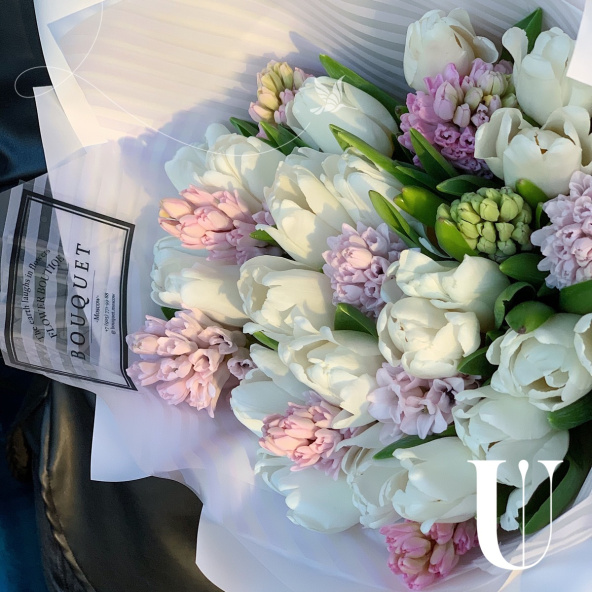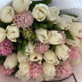 Белые тюльпаны - 25 штук, гиацинты розовые - 10 штук, упаковка пленка