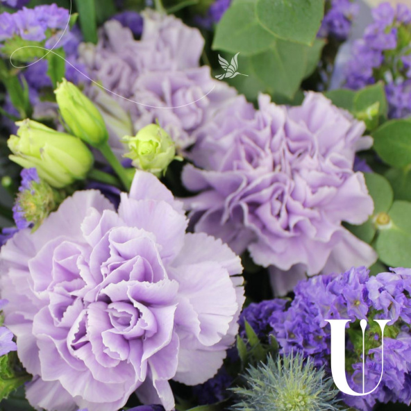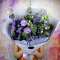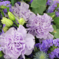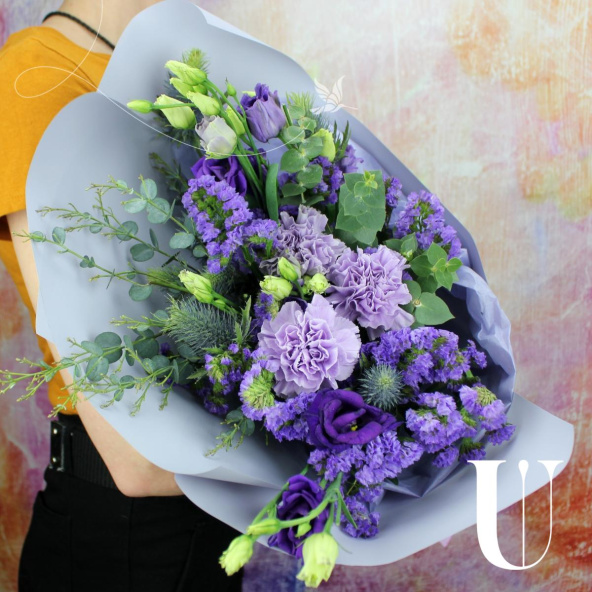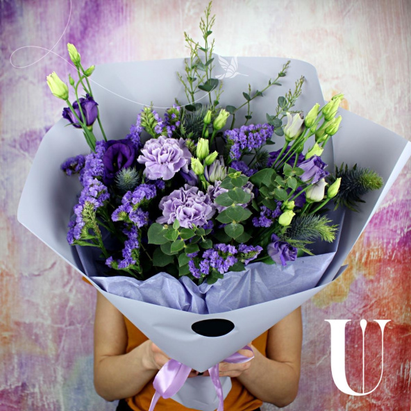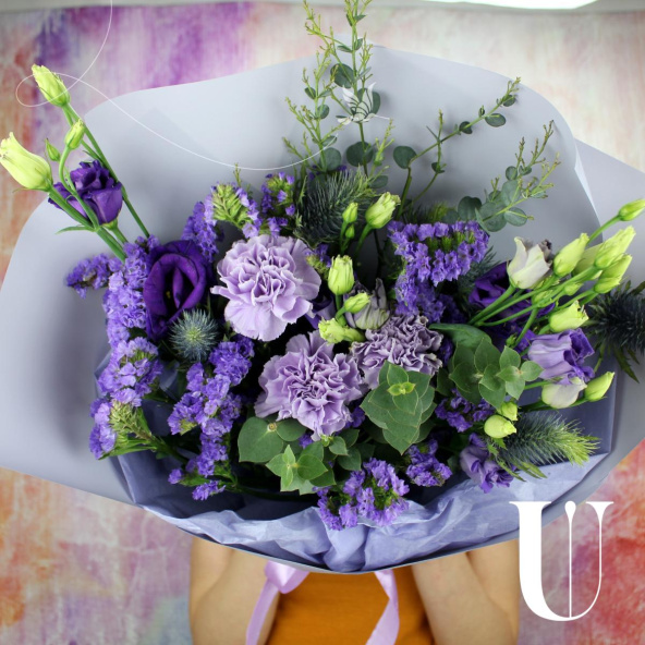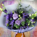 Микс из фиолетовых и кремовых диантусов в дизайнерской упаковке