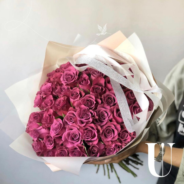 49 роз глубокого сиреневого цвета в плёнке с атласной лентой
