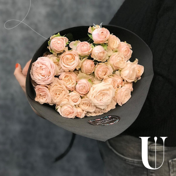 Монокомпозиция из кустовых роз в дизайнерской упаковке