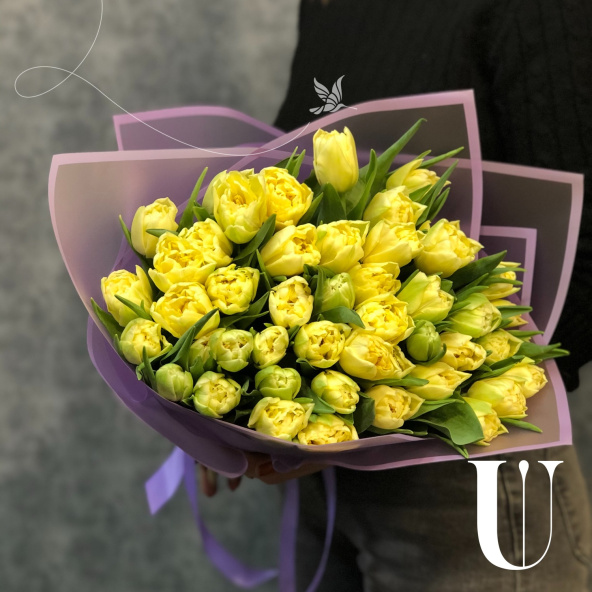 Монобукет из 9 подсолнухов в лавандовой упаковке