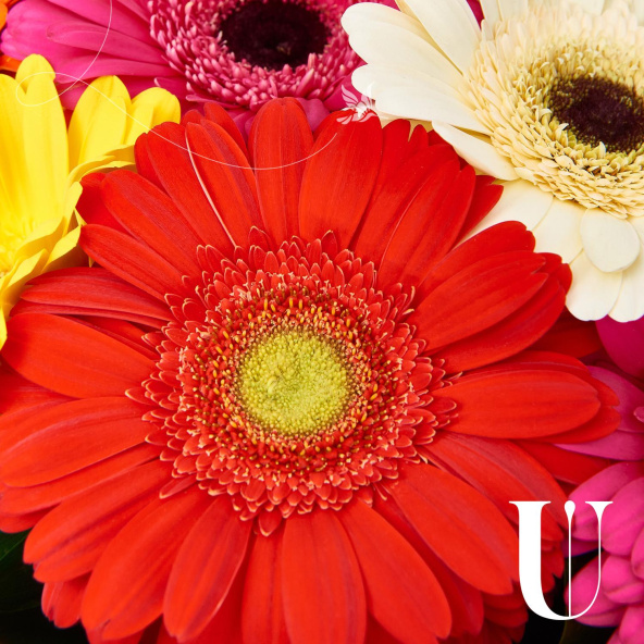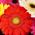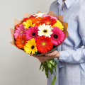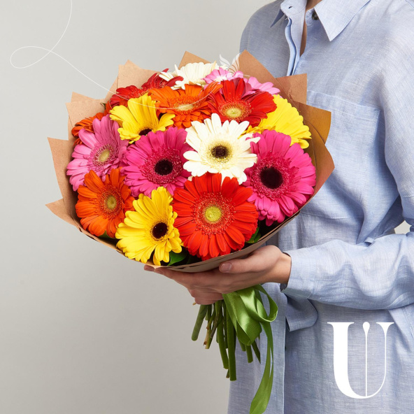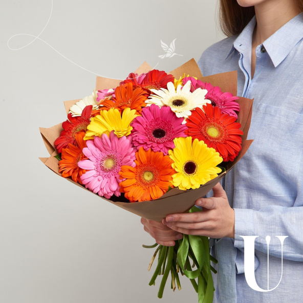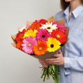 Букет из роз сорта Гран При и красных гербер в упаковке
