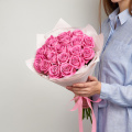 Букет из 11 розовых кустовых роз в дизайнерской бумаге