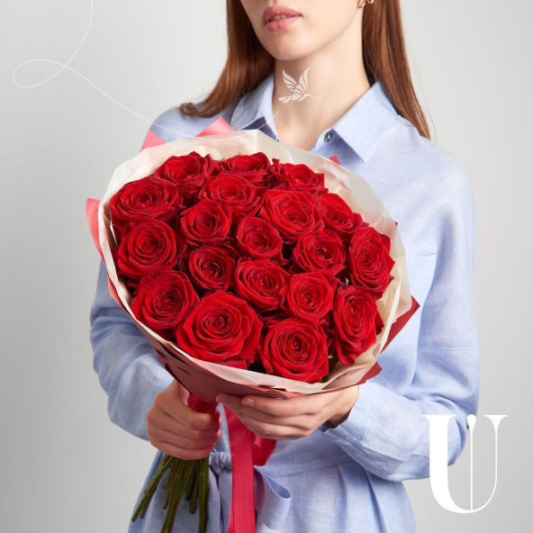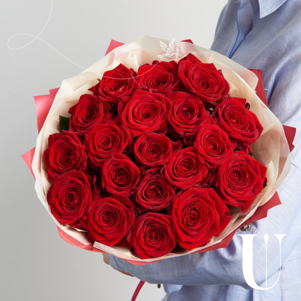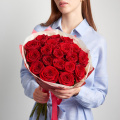 Мини-букет из 25 красных роз в упаковке с атласной лентой