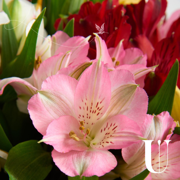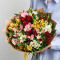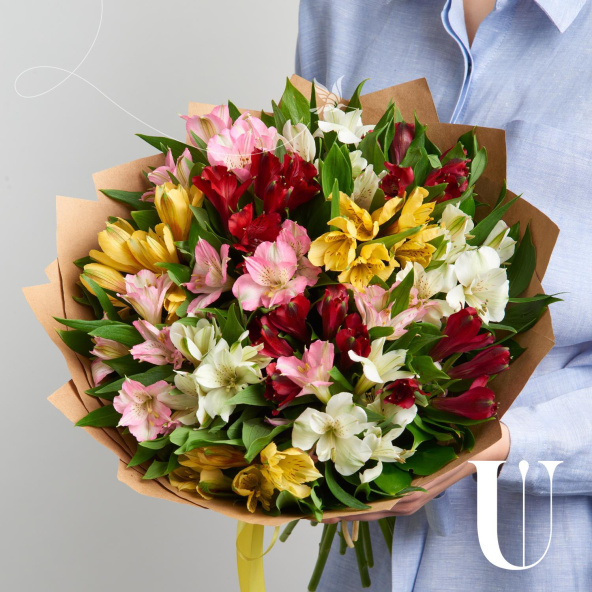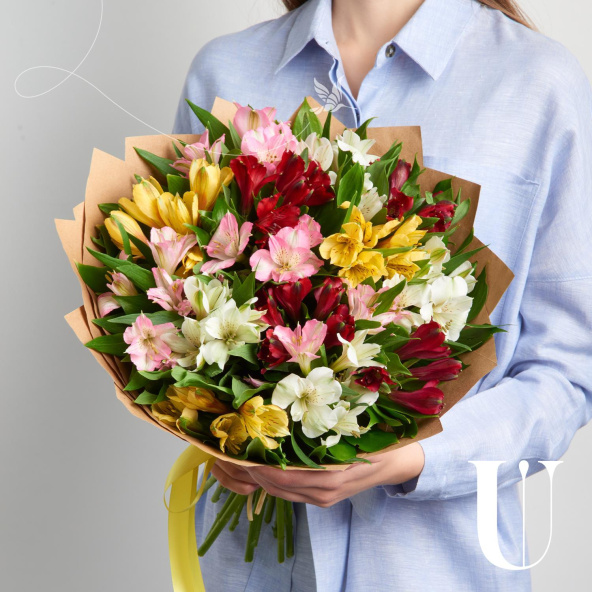 Букет из 11 альстромерий микс с зеленью в упаковке