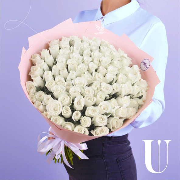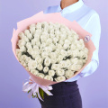 Монобукет из 51 белой розы Аваланж 40 см в глянцевой пленке