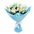 Монобукет из белых кустовых хризантем в голубой упаковке