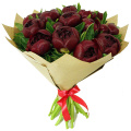 Монокомпозиция из малиновых роз в бежевой упаковке