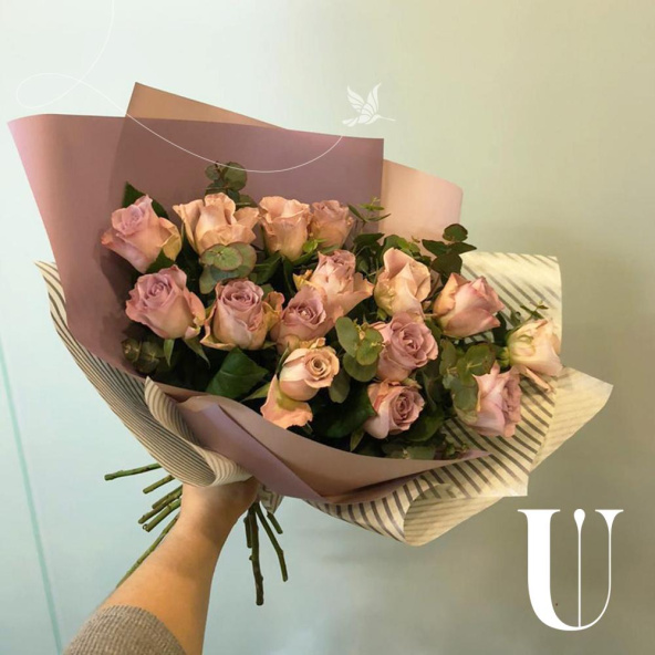 Букет из 19 персиковых роз в дизайнерской упаковке