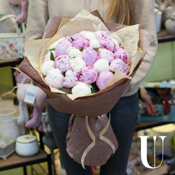 Букет состоит из 27 розовых и белых пионов, что делает его ярким и запоминающимся.