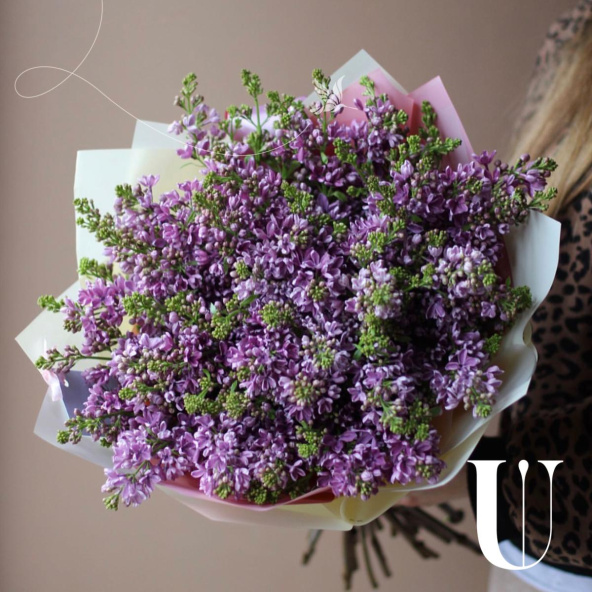 19 ветвей пышной ароматной сирени упакованной в пленку с атласной лентой