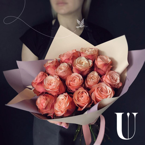 Монобукет из 15 роз сорта Аваланж и Аква подчеркнет ваш вкус и внимание к деталям