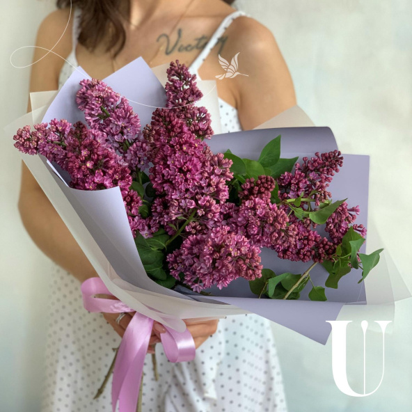 Букет из фиолетовых хризантем и кремовых диантусов в дизайнерской бумаге