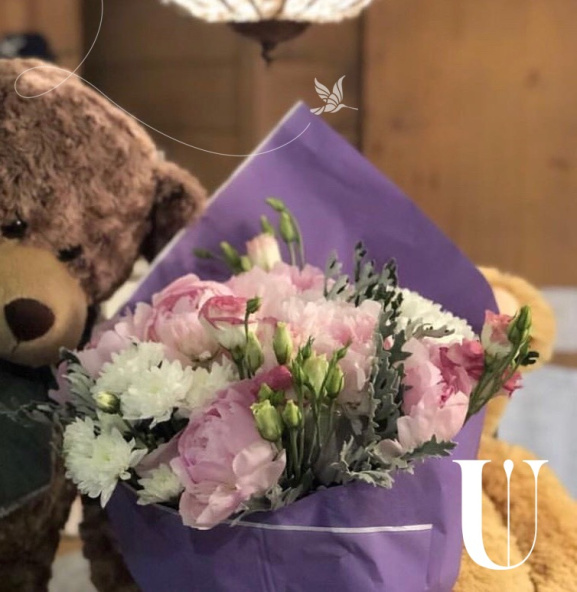 Монобукет из розовых роз и розового лагуруса в матовой пленке