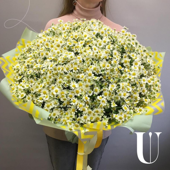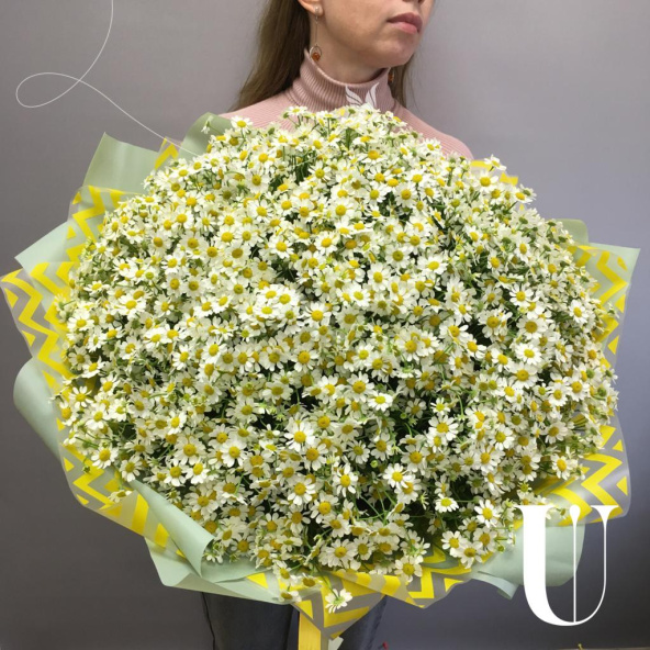 Огромный букет из ромашки и гипсофилы в матовой пленке