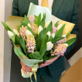 Букет из белых диантусов, нобилиса и белых шаров в упаковке