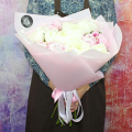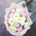 Букет из белых кустовых пионовидных роз сорта Бомбастик в упаковке
