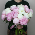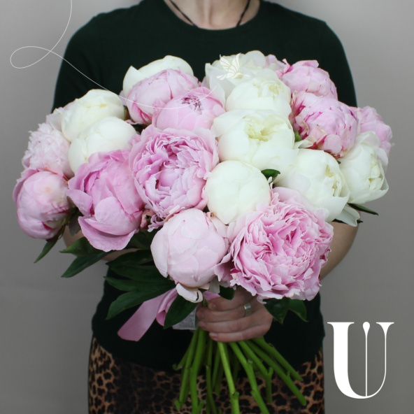 Монобукет из 15 нежно-розовых пионов с розовой лентой