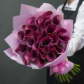 Каллы бордо - 25 шт., пленка матовая в белую полоску, розовая пленка, розовая лента.