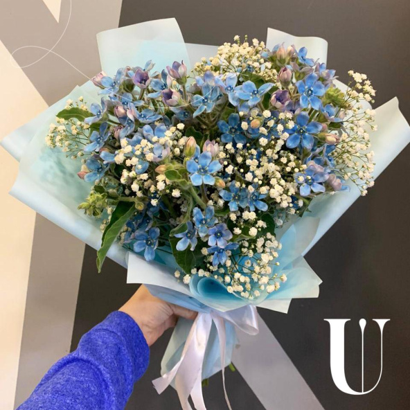 Монобукет из голубой гипсофилы в дизайнерской упаковке