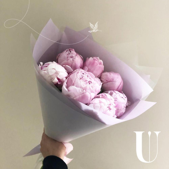 Букет из 7 розовых пионов в дизайнерской пленке