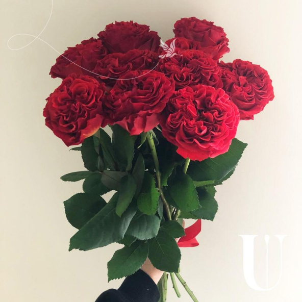 Монобукет из пионовидных роз сорта Лондон Ай в упаковке