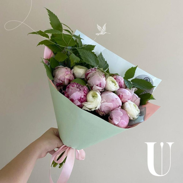 Монобукет из 9 розовых пионов в дизайнерской упаковке