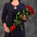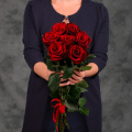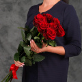Монобукет из 15 роз сорта Ред Наоми 60 см с атласной лентой