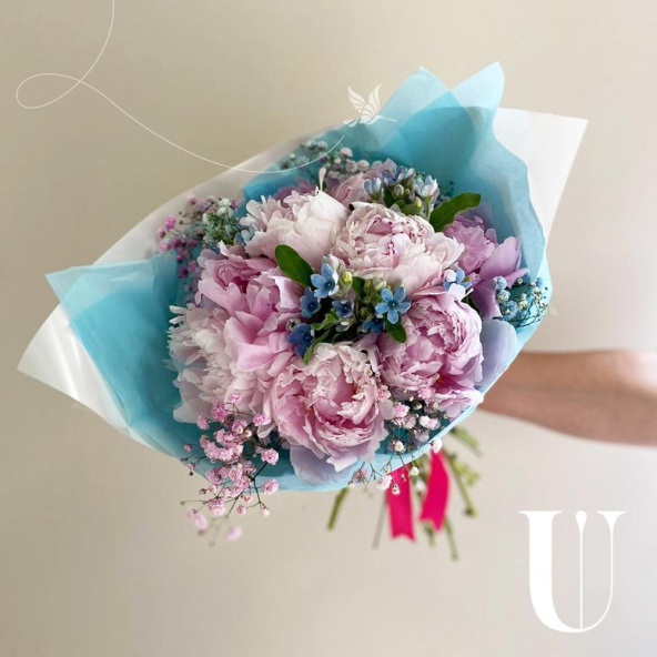 Мини-букет из 5 розовых пионов в пленке