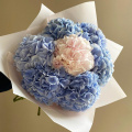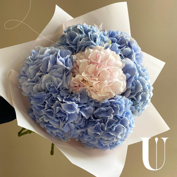 Большой букет из розовых и белых гортензий в дизайнерской упаковке