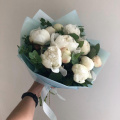 Букет из белых пионовидных роз и нежных кустовых роз в упаковке
